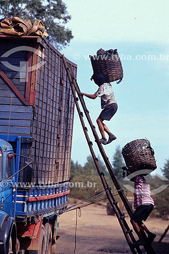 •  Charcoal burners loading a truck with baskets full of coal -  Jequitinhonha Valley - Minas Gerais state - Brazil