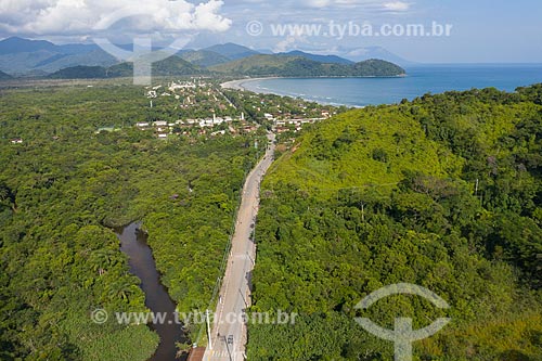 Drone view of the Sahy River and the APA Baleia Sahy Environmental Protection Area - Baleia Beach in the background - Sao Sebastiao city - Sao Paulo state (SP) - Brazil