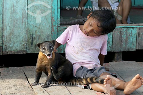 Indigenous child of Canamaris tribe with ring-tailed coati (Nasua nasua) - Uacari Sustainable Development Reserve - Carauari city - Amazonas state (AM) - Brazil