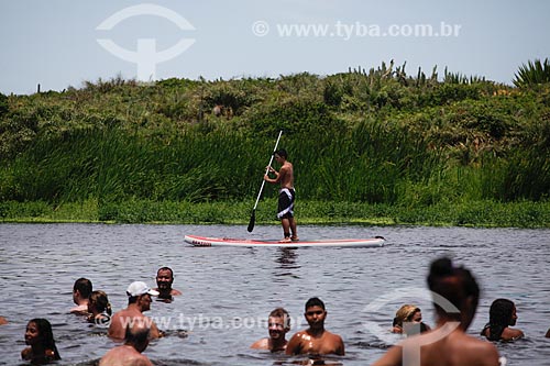 Practitioner of stand up paddle and bathers - Iriri Lagoon - also known as Coca-Cola Lagoon - Rio das Ostras city - Rio de Janeiro state (RJ) - Brazil