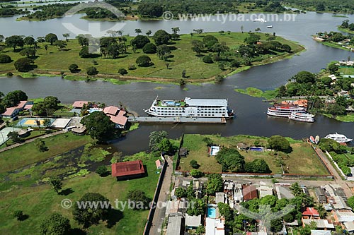 Aerial photo of the Iberostar Grand Amazon cruise ship in the Parana of Princesa - branch of the Amazon River - preparing to berth at Coca-Cola Club (old Kuat Club) - Parintins city - Amazonas state (AM) - Brazil