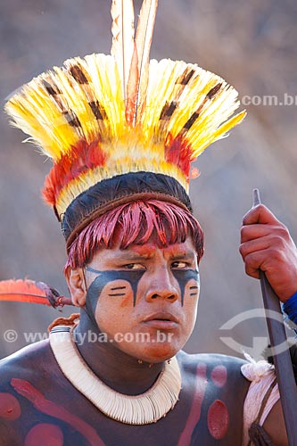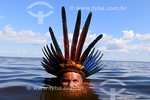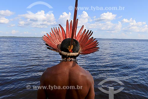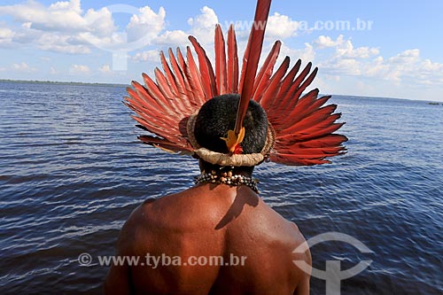 Yawalapiti indian wearing a headdress known as tunacape (cocar) during the Kuarup - this years ceremony in honor of the anthropologist Darcy Ribeiro - Photo Licensed (Released 94) - INCREASE OF 100% OF THE VALUE OF TABLE - Gaucha do Norte city - Mato Grosso state (MT) - Brazil
