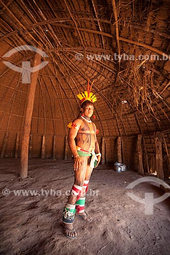 Yawalapiti indian inside the maloca reserved to men - Casa dos Homens - during the Kuarup ceremony - this years ceremony in honor of the anthropologist Darcy Ribeiro - Photo Licensed (Released 94) - INCREASE OF 100% OF THE VALUE OF TABLE - Gaucha do Norte city - Mato Grosso state (MT) - Brazil