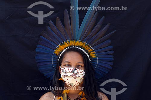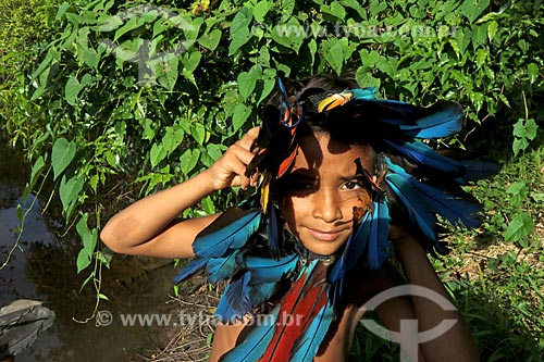 Indian with cocar made of plastic drinking straw - to not use bird feather - Moikarako Tribe - Kayapo Indigenous Land - Sao Felix do Xingu city - Para state (PA) - Brazil