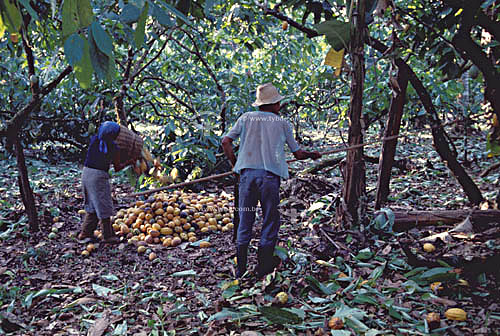 •  Workers manually harvesting cocoa fruit - South of Bahia state - Brazil