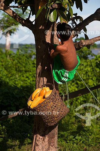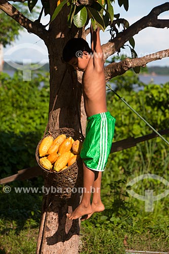 •  Boy - cocoa tree (Theobroma cacao) during harvest of native cacao - Madeira River region  - Novo Aripuana city - Amazonas state (AM) - Brazil