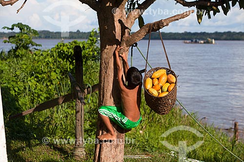 Boy - cocoa tree (Theobroma cacao) during harvest of native cacao - Madeira River region - Novo Aripuana city - Amazonas state (AM) - Brazil