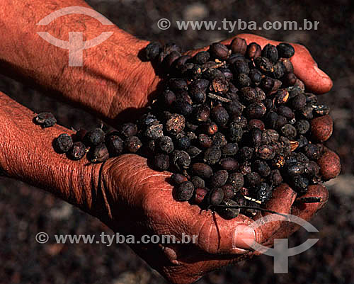 •  Detail of hands holding dried coffee beans (Coffea arabica) - Baturite Mountain - Guaramiranga region - Ceara state - Brazil
