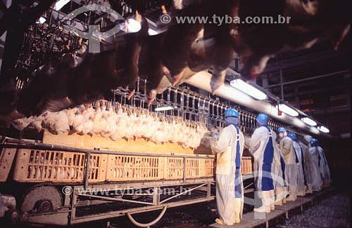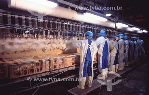 •  Agro-Industry (Agro Industry) - Poultry: worker and chicken on cold storage room - Sadia Chicken farm - Concordia Village - Santa Catarina state - Brazil - Date: 2002