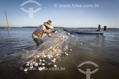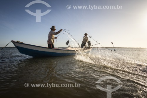 • Fishermen in a boat collecting fishing nets in the Parnaiba Delta - Araioses city - Maranhao state (MA) - Brazil