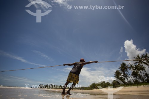 Fisherman collecting fishing net - Riacho Beach - Prado city - Bahia state (BA) - Brazil