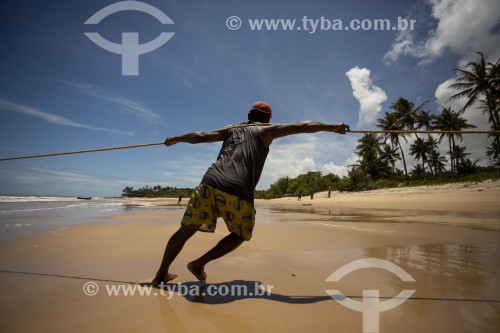 • Fishermen collecting fishing net - Riacho Beach - Prado city - Bahia state (BA) - Brazil