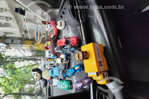Collection of childrens toys decorating the interior of a taxi dashboard - Rio de Janeiro city - Rio de Janeiro state (RJ) - Brazil