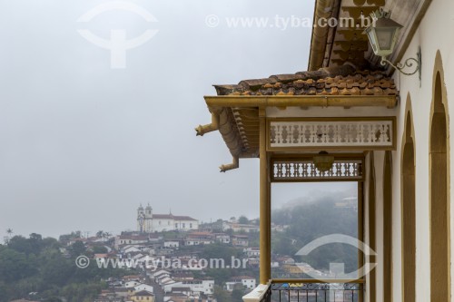 Detail of the balcony of a colonial house in the center of Ouro Preto with the Church of Santa Efigenia in the background - Ouro Preto city - Minas Gerais state (MG) - Brazil