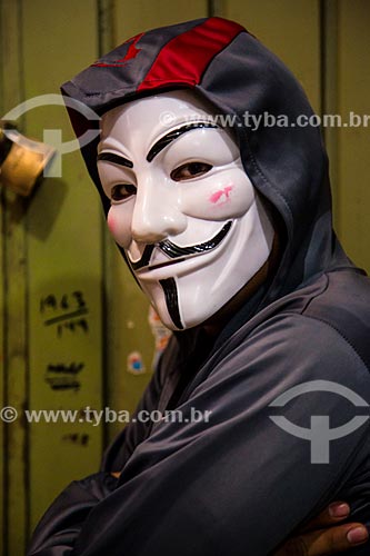 Demonstrator masked during the protest of the Free Pass Movement - mask used in the movie V for Vendetta (2006) based on the design of the character V comic book by Alan Moore and David Lloyd who in turn was inspired by the face of Guy Fawk - Rio de Janeiro city - Rio de Janeiro state (RJ) - Brazil