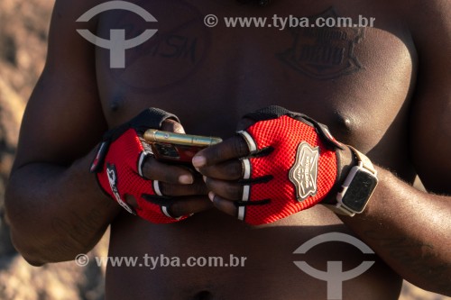• Detail of a man with a glove using a cell phone - Arpoador - Rio de Janeiro city - Rio de Janeiro state (RJ) - Brazil