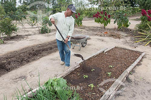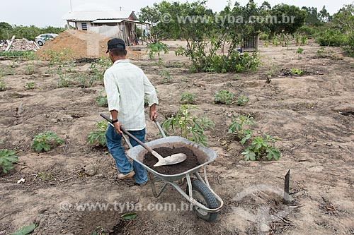 Indian transporting organic fertilizer in wheelbarrow - Tupiniquim ethnic group Pau Brasil - Aracruz city - Espirito Santo state (ES) - Brazil