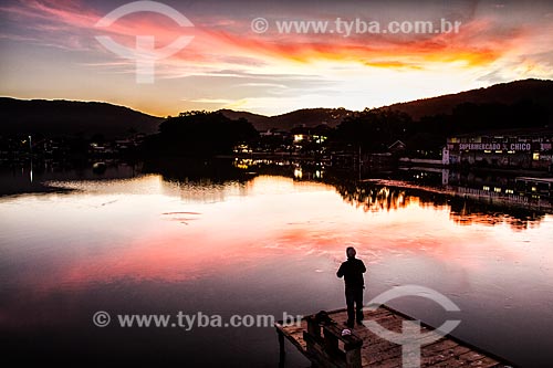 Silhouette of a man on a deck at Conceicao Lagoon at dusk - Florianopolis city - Santa Catarina state (SC) - Brazil