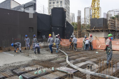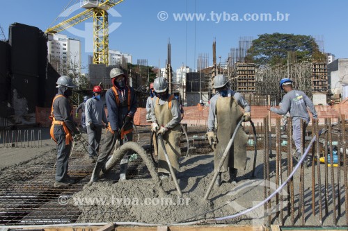 • Workers filling the slab of a building under construction with concrete in Vila Romana - Workers wearing a mask due to the coronavirus pandemic - Sao Paulo city - Sao Paulo state (SP) - Brazil