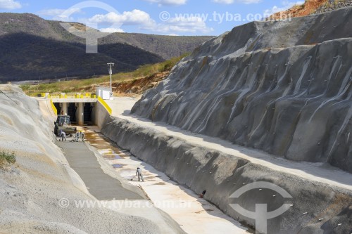 Workers on the Apodi branch of the Sao Francisco River Transposition - control system with floodgates in the background - sprayed concrete on the right slope - Project of Integration of Sao Francisco River with the watersheds of Northeast setentrional - Cajazeiras city - Paraiba state (PB) - Brazil
