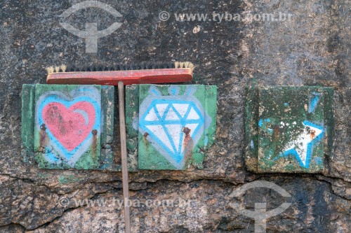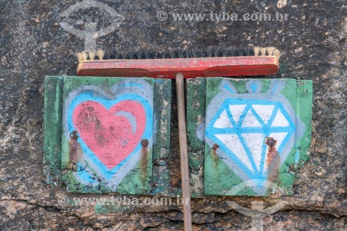• Broom used to clean streets leaning against painted wall on concrete slabs - Arpoador - Rio de Janeiro city - Rio de Janeiro state (RJ) - Brazil