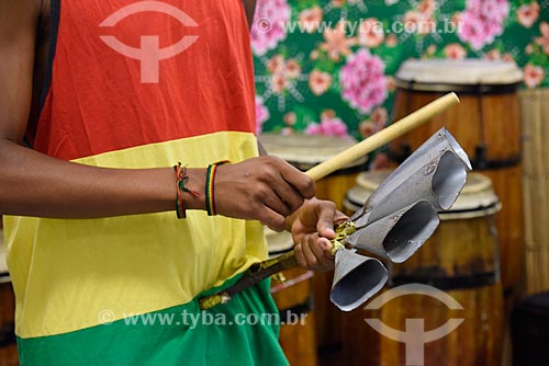 Detail of shekere - to the left - and agogô - to the right - during the concentration to Afoxe Ile Ala carnival street troup - Atlantica Avenue - Rio de Janeiro city - Rio de Janeiro state (RJ) - Brazil