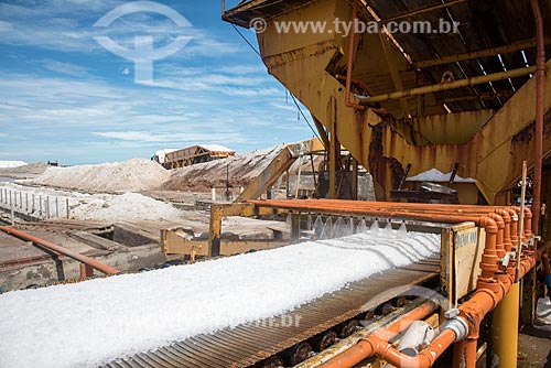 Salt washing during extraction with conveyor belt - evaporation ponds - Macau city - Rio Grande do Norte state (RN) - Brazil