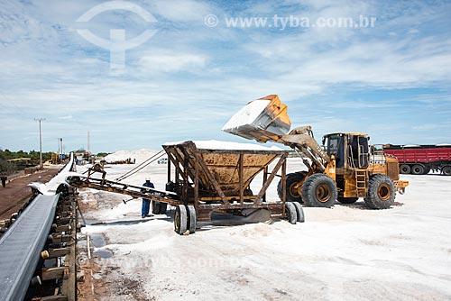 Bulldozer pouring salt - conveyor belt - extraction of salt - evaporation ponds - Macau city - Rio Grande do Norte state (RN) - Brazil