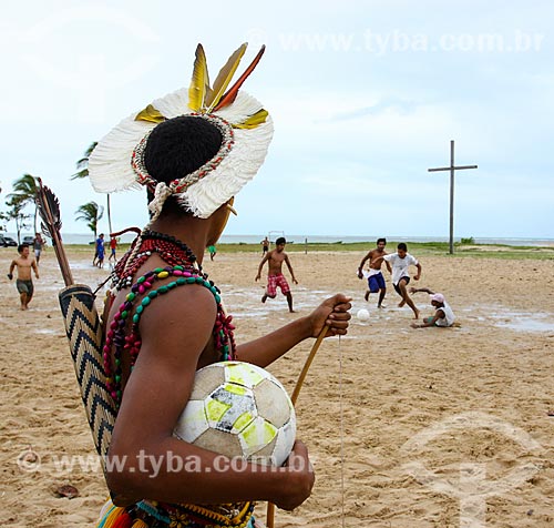 Indian of Pataxo tribe playing soccer with the Cross in Coroa Vermelha - region where disembarked Pedro Alvares Cabral and where the first Mass was held in Brazil - in the background - Santa Cruz Cabralia city - Bahia state (BA) - Brazil
