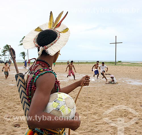 •  Indian of Pataxo tribe playing soccer with the Cross in Coroa Vermelha - region where disembarked Pedro Alvares Cabral and where the first Mass was held in Brazil - in the background  - Santa Cruz Cabralia city - Bahia state (BA) - Brazil