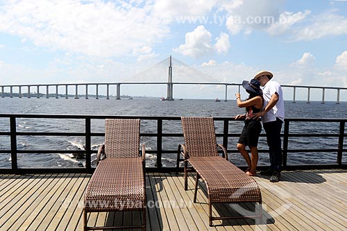Couple observing the Negro River from boat with the Negro River Bridge in the background - Manaus city - Amazonas state (AM) - Brazil
