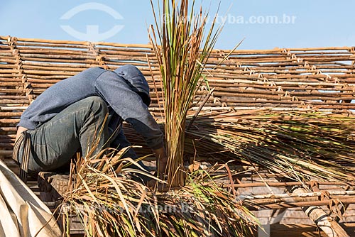 Indian doing the hut cover with thatch - Aiha village of the Kalapalo tribe - INCREASE OF 100% OF THE VALUE OF TABLE - Querencia city - Mato Grosso state (MT) - Brazil