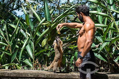 Man feeding a crab-eating raccoon (Procyon cancrivorus) - Tijuca National Park - Rio de Janeiro city - Rio de Janeiro state (RJ) - Brazil