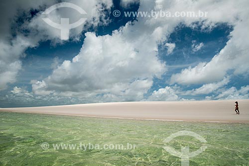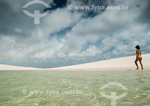 Woman walking on the banks of America Lagoon - Lencois Maranhenses National Park - Santo Amaro do Maranhao city - Maranhao state (MA) - Brazil
