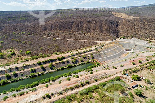 Picture taken with drone of the north axis channel of the Sao Francisco River Transposition after the mouth of the Cuncas I tunnel - Morros reservoir in the background - Project of Integration of Sao Francisco River with the watersheds of Northeast setentrional - Sao Jose de Piranhas city - Paraiba state (PB) - Brazil