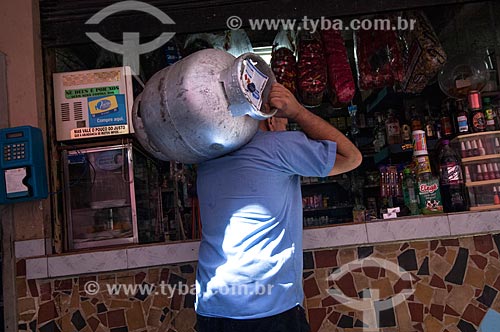•  Subject: Man carrying gas cylinder in front of the bar in Turano Hill / Place: Rio de Janeiro city - Rio de Janeiro state (RJ) - Brazil / Date: 04/2011