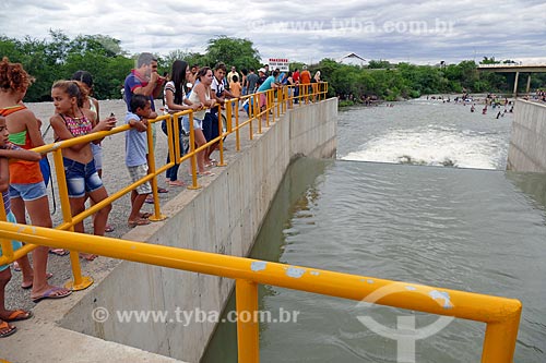 •  People observing the spillway pouring water into the Paraiba River - Project of Integration of Sao Francisco River  - Monteiro city - Paraiba state (PB) - Brazil