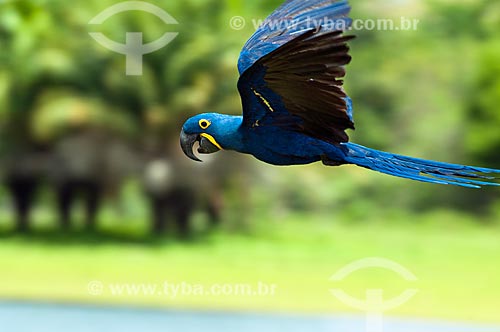 •  Subject: Wild Hyacinth Macaw (Anodorhynchus hyacinthinus) flying / Place: Corumba city - Mato Grosso do Sul state (MS) - Brazil / Date: 10/2010