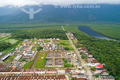 Picture taken with drone of the Doutor Manuel Hipolito Rego Highway (SP-055) with the Itaguare River - Bertiogas Restinga State Park - Bertioga city - Sao Paulo state (SP) - Brazil