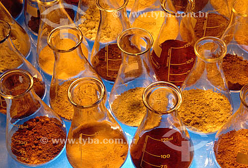 •  Different kinds of powders stored in Erlenmeyer flasks