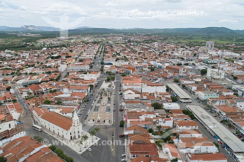 Picture taken with drone of the Francisco Sa Square - also known as Cristo Rei Square (Christ the King Square) - with the Saint Anne Church (1808) in the background - Currais Novos city - Rio Grande do Norte state (RN) - Brazil
