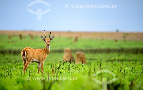 Pampas deer (Ozotoceros bezoarticus) near to termite mounds - Emas National Park - Mineiros city - Goias state (GO) - Brazil