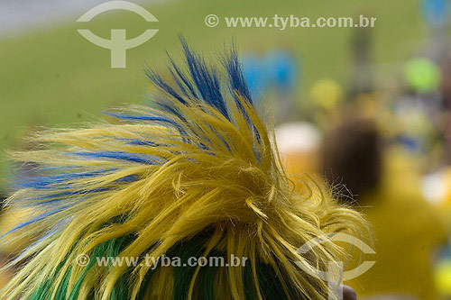 Detail of woman hair painted with brazlilian flag colours - Panamerican Olympics Rio 2007 - Rio de Janeiro city - Rio de Janeiro state - Brazil