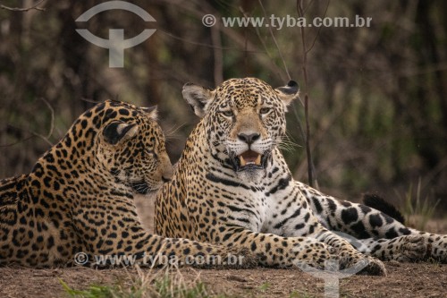 • Female jaguar (Panthera onca) playing with cub - Refugio Caiman - Miranda city - Mato Grosso do Sul state (MS) - Brazil