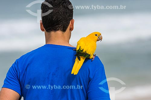 Man running with a golden parakeet (Guaruba guarouba) on his shoulder - Barra da Tijuca Beach waterfront - Rio de Janeiro city - Rio de Janeiro state (RJ) - Brazil