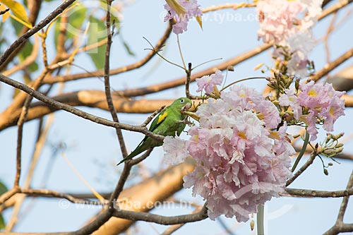 •  Yellow-chevroned Parakeet (Brotogeris chiriri) eating flowers of pink ipe tree (Tabebuia heptaphylla)   - Goias city - Goias state (GO) - Brazil