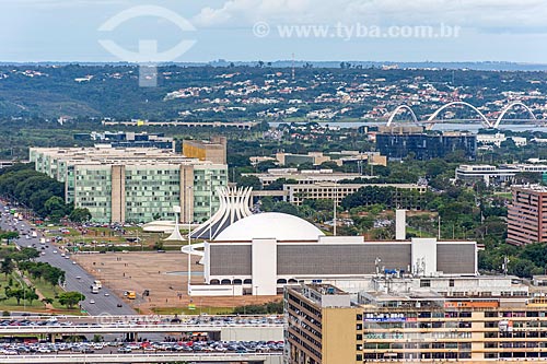 Top view of the Monumental Axis with Honestino Guimaraes National Museum and Metropolitan Cathedral of Nossa Senhora Aparecida - Paranoa lake in the background - Brasilia city - Distrito Federal (Federal District) (DF) - Brazil