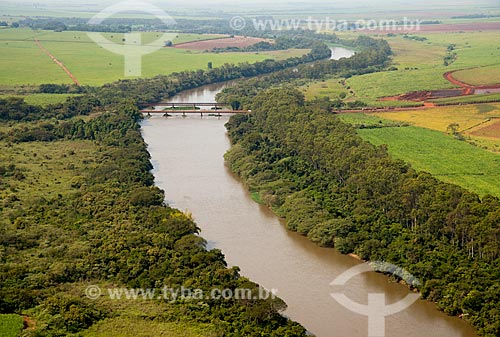 • Picture taken with drone of the Pardo River with the bridge on the Assis Chateaubriand Highway (SP-425) - boundary between the municipalities of Guaira and Barretos - Guaira city - Sao Paulo state (SP) - Brazil