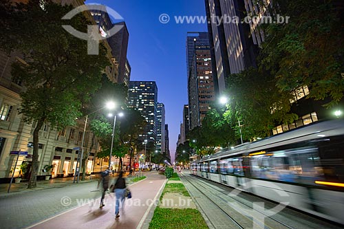 Light rail transit transiting on Passeio Publico of Rio Branco Avenue during the nightfall - Rio de Janeiro city - Rio de Janeiro state (RJ) - Brazil