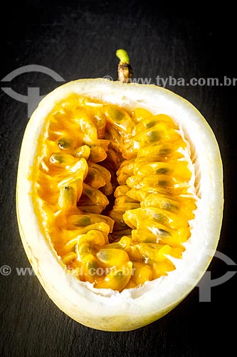 •  Detail of passion fruit (Passiflora edulis) in half  - Brazil